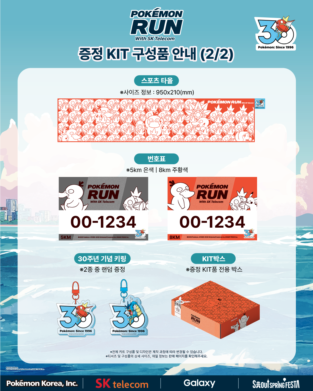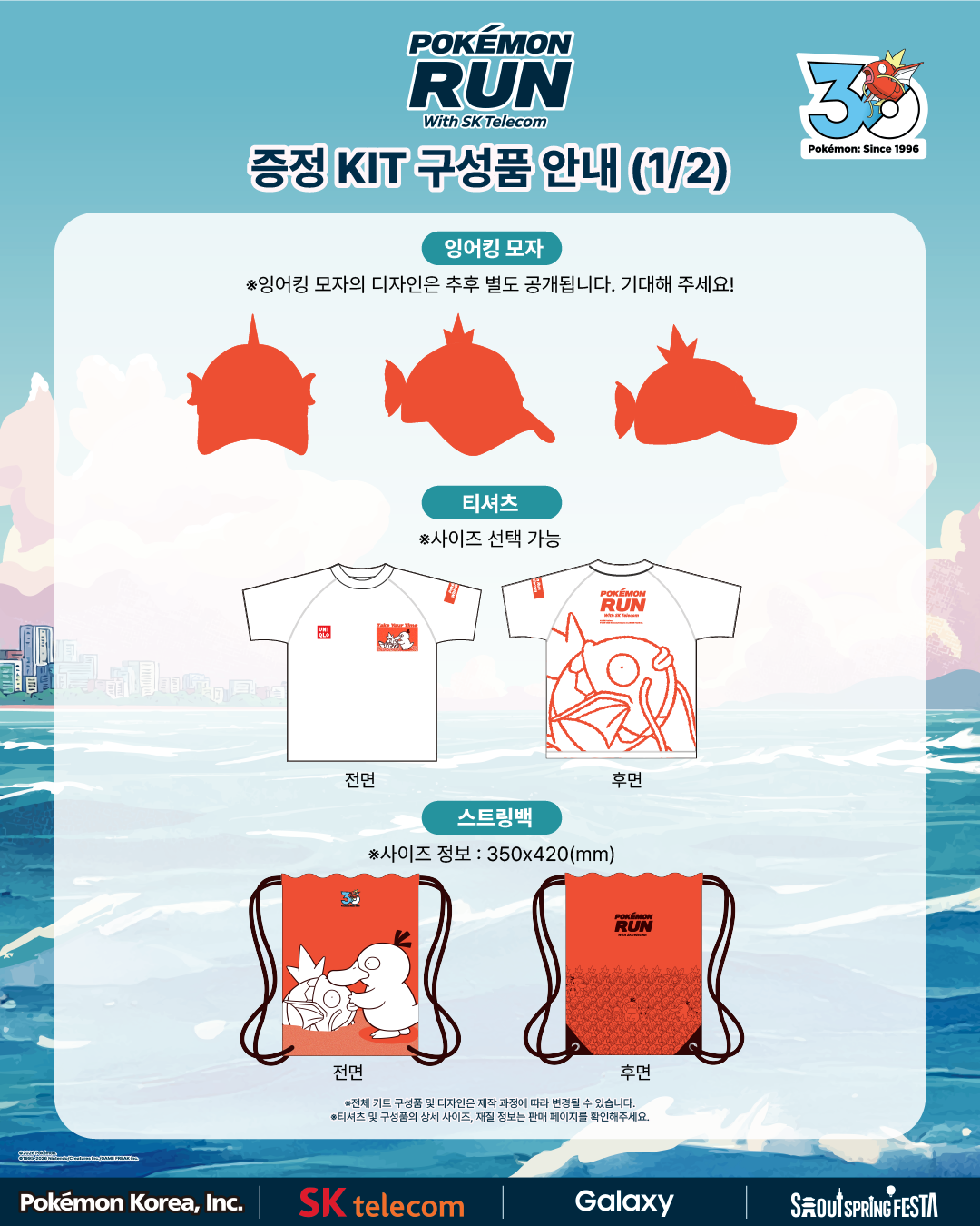 패키지 구성: 잉어킹 모자, 티셔츠, 스트링 백, 스포츠 타월, 30주년 기념 랜덤 키링, 전용 박스 등